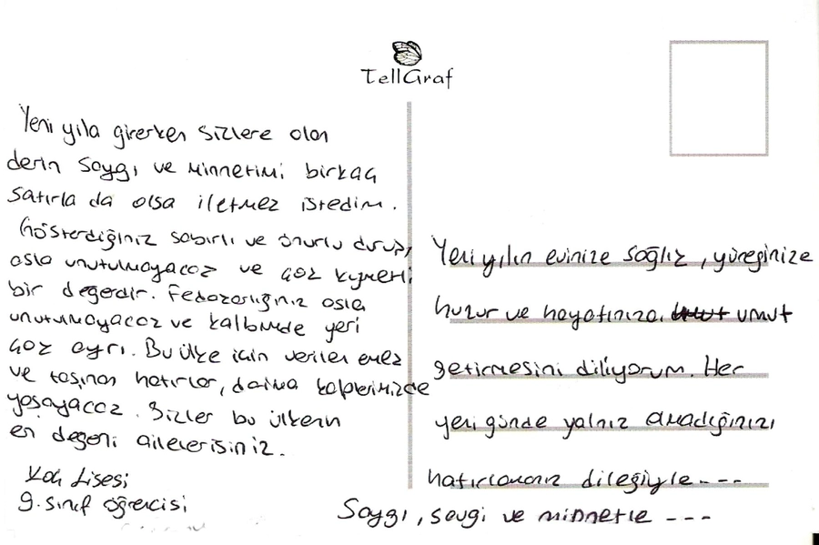 Bizler için gelen her bir kart, sadece bir yeni yıl tebriği değil, aynı zamanda şehitlerimizin emanetlerine uzanan sıcak bir eldir. İstanbul’da eğitim gören, yürekleri vatan sevgisiyle dolu evlatlarımızın bu hassasiyeti bizlere güç verdi. Elif, Yaren, Alya, Gözde, Hülya, Pınar, İclal, Nursel, Cumhur, Kaan, Emre, Asel, Elif Naz, Gökçe, Kuzey, Ecrin, Doğa ve Merve evlatlarımıza; şehit ailelerimiz ve gazilerimiz adına gönülden teşekkür ediyorum.