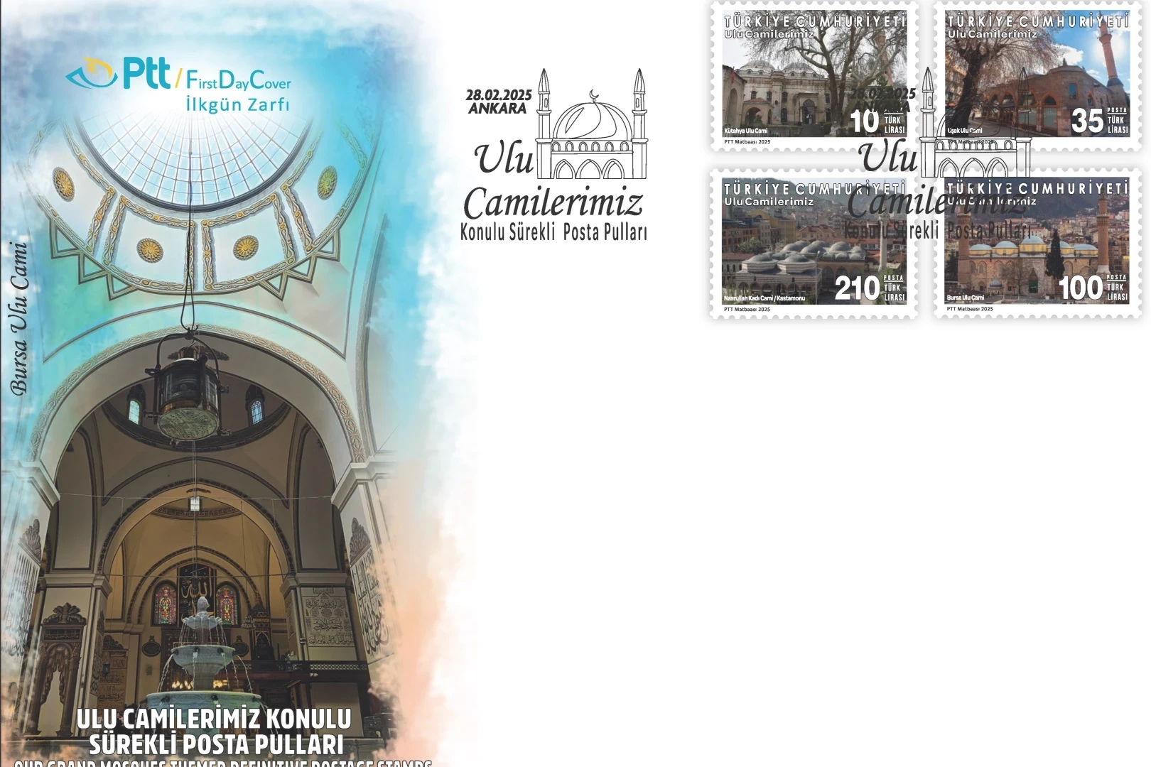 PTT AŞ, “Ulu Camilerimiz” konulu sürekli posta pullarını 28 Şubat 2025 tarihinde tedavüle sundu.